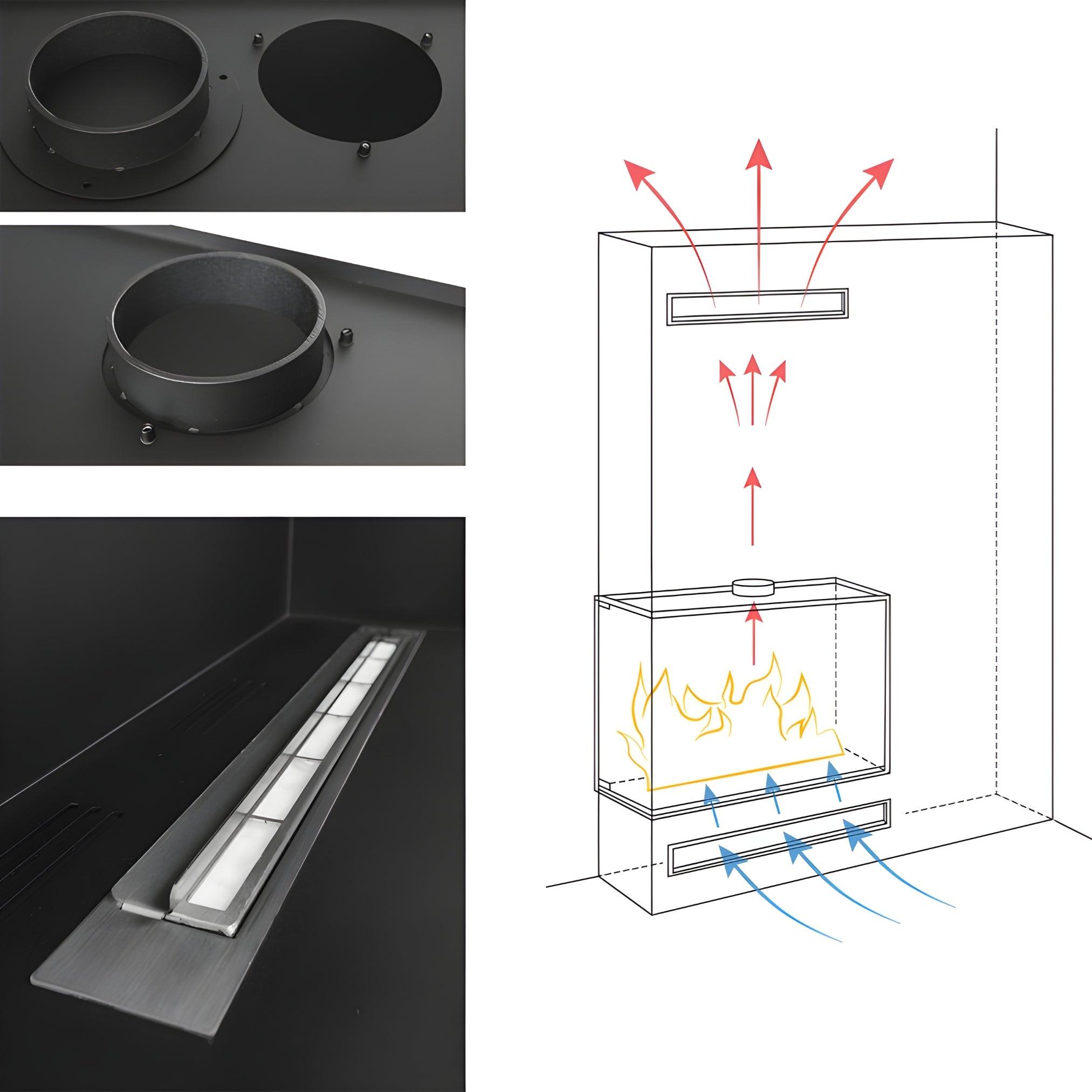 The lower part of the corner fireplace has holes for air intake. The upper part has an opening for airflow from the fireplace. When installing in plasterboard or masonry, it's therefore advisable to create two ventilation holes, one below the fireplace and one above. By creating a closed circuit, you get 100% of the heat from the fireplace in your room. Because it's an inset fireplace, there's no need for a chimney or external air supply, unlike with a traditional open fireplace.